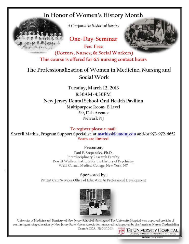 On March 12, 2013, Paul E. Stepansky gave a one-man, all-day conference, “The Professionalization of Women in Medicine, Nursing, and Social Work: A Comparative Historical Inquiry,” to the medical, nursing, and social work staffs of University Hospital of the University of Medicine and Dentistry of New Jersey. The conference comprised five successive lectures, with audience comments and questions, on the following topics: